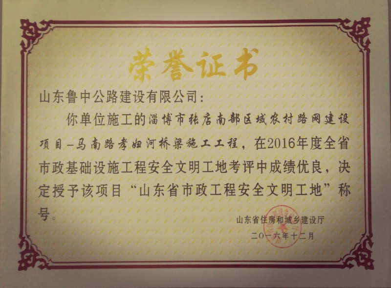 1月3日,經(jīng)確認(rèn),由我山東魯中公路建設(shè)有限公司承建的“淄博市張店南部區(qū)域農(nóng)村路網(wǎng)建設(shè)項(xiàng)目—馬南路孝婦河橋梁工程項(xiàng)目”被山東省住房和城鄉(xiāng)建設(shè)廳授予“山東省市政工程安全文明工地”榮譽(yù)稱號(hào),在新年伊始便迎來了2017年的開門紅。