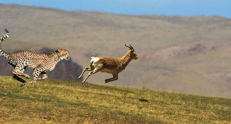 獵豹是短跑速度最快的動(dòng)物,瞬間時(shí)速超過(guò)115公里。獵豹的主要食物是羚羊,奔跑速度很快,時(shí)速超過(guò)80公里,它們的聽(tīng)覺(jué)也十分的靈敏,稍有風(fēng)吹草動(dòng),它們頓時(shí)就會(huì)跑出百米之外,而且比獵豹的耐力更強(qiáng),所以,如果獵豹發(fā)起攻擊時(shí)離跳羚太遠(yuǎn),跳羚就很有可能逃掉。