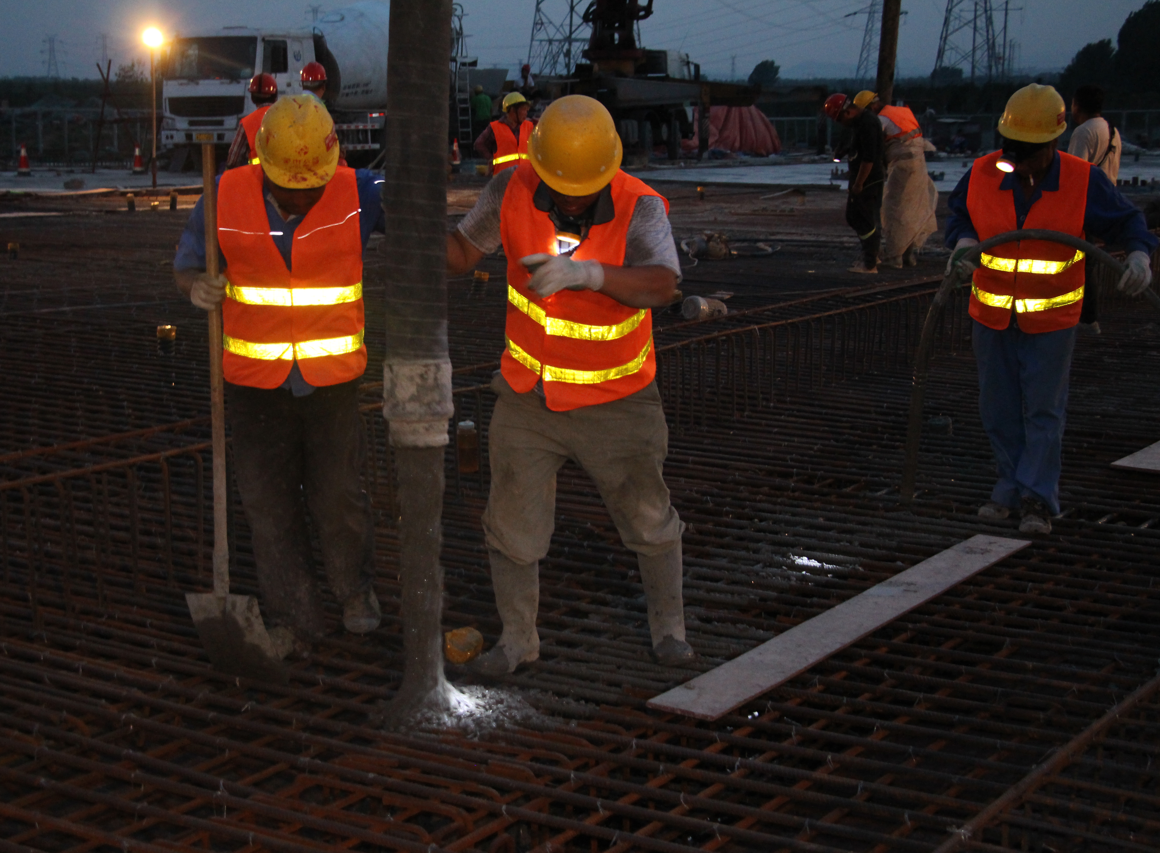 6月18日夜間,混凝土澆筑現(xiàn)場的施工人員忙碌的工作著