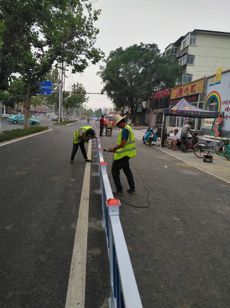 路面工程分公司承接的人民路公交隔離護欄目前正在進行安裝工作,人民路公交隔離護欄共計長度5030米,現(xiàn)已完成安裝3600米,項目部積極投入人員和機械力量,現(xiàn)場人員加班加點,保證以最快的速度完成。根據(jù)項目部計劃7月15日完成人民路公交護欄的安裝工作。新型公交護欄采用白色底漆,豎桿加以藍色反光噴漆,立柱安裝太陽能柱帽,新型公交護欄的安裝已成為人民路上一道亮麗的風景線,實現(xiàn)了公交車與非機動車的隔離作用,既保障了行車安全又改善了人民路交通擁擠的狀況。