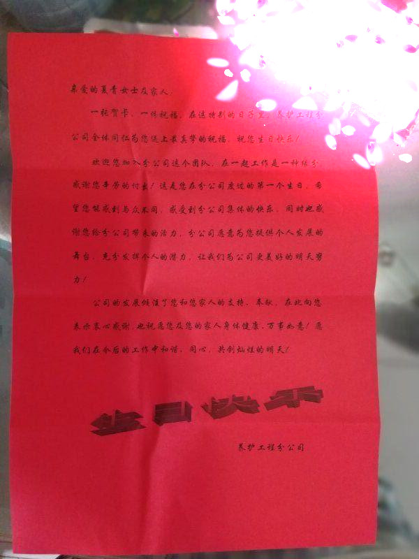 愛無形無色,可它有時卻讓大家痛徹心扉,有時又讓大家欣喜若狂,悲喜交加,可誰又說這不是一個有愛才存在的世界呢?愛不能用金錢去衡量,養(yǎng)護分公司領導能把職工的生日都記得并給大家派送禮品蛋糕賀卡,細微之處盡顯愛意,讓大家體會到團隊的溫暖,集體榮譽責任感,讓所在職工體會到愛的真正涵義,更懂得付出,我們的公路事業(yè)定會因為愛而更加美好和順利!