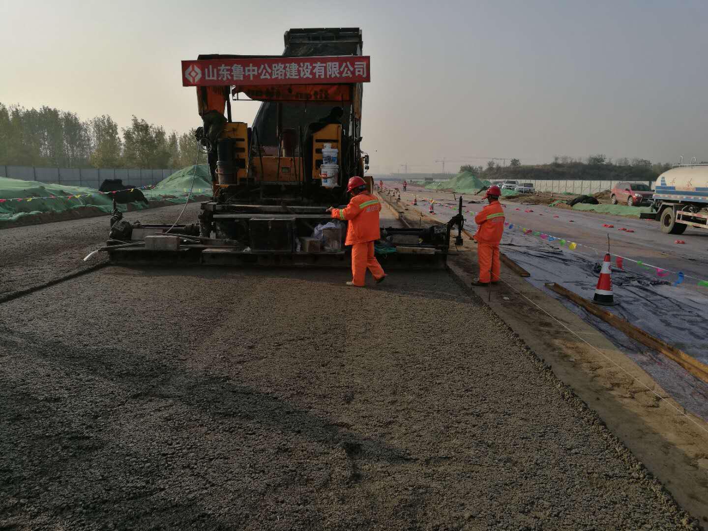 高鐵新城站東路水泥穩(wěn)定碎石基層試驗(yàn)段成功攤鋪