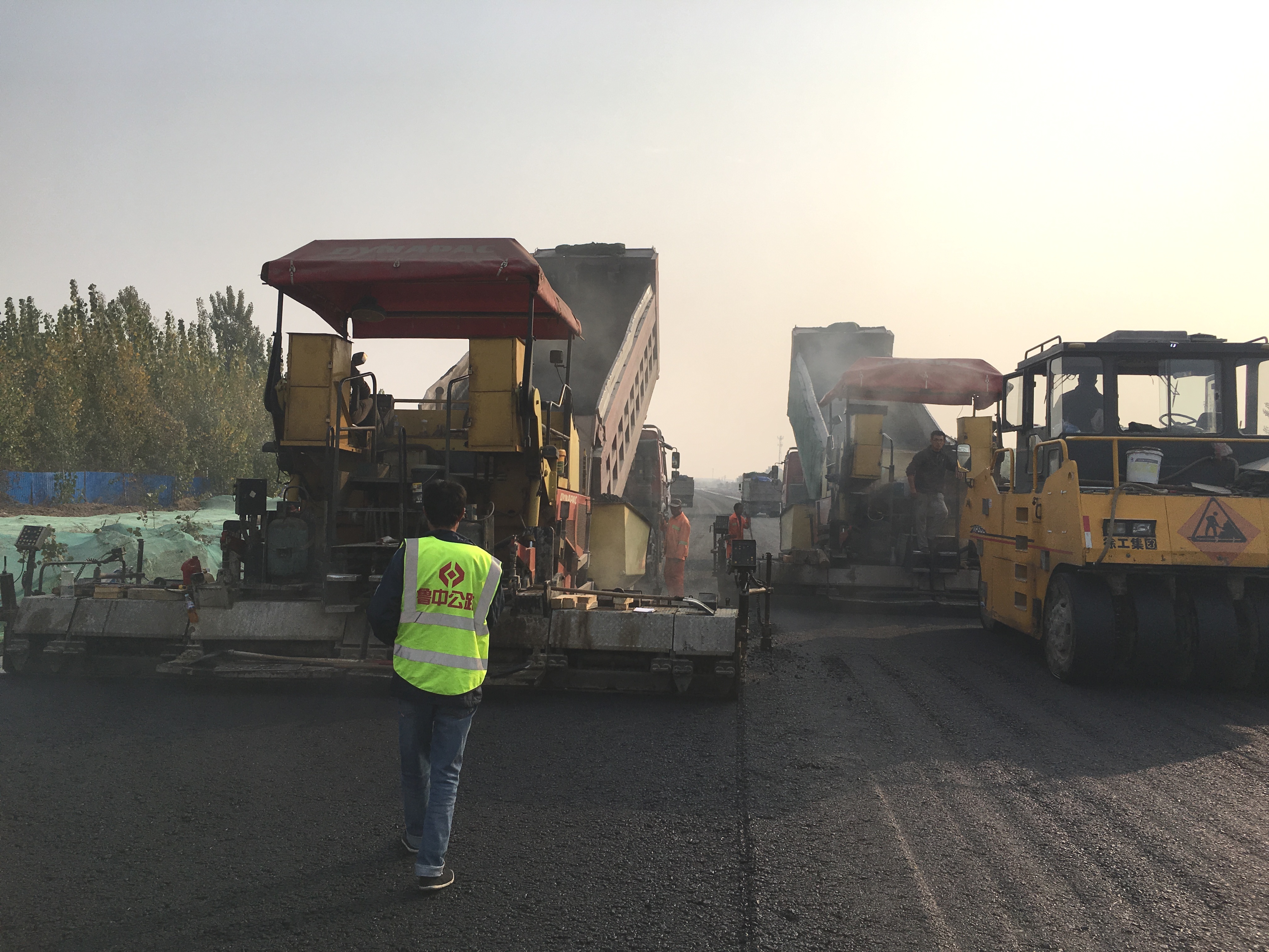 在精心準(zhǔn)備下,11月7日,我部順利完成了200米瀝青下面層試驗(yàn)段攤鋪工作。此次試驗(yàn)位于K10+540-K10+740段左幅,施工現(xiàn)場(chǎng)采用2臺(tái)攤鋪機(jī)半幅連續(xù)攤鋪壓路機(jī)跟進(jìn)壓實(shí)的施工工藝,經(jīng)過(guò)5個(gè)多小時(shí)緊張的施工,最終完成了AC-25C下面層試驗(yàn)段的試鋪。攤鋪過(guò)程中,項(xiàng)目部領(lǐng)導(dǎo)及主要管理人員全程堅(jiān)守在施工現(xiàn)場(chǎng),從壓路機(jī)清潔、溫度控制、攤鋪厚度、壓實(shí)度、平整度、現(xiàn)場(chǎng)檢測(cè)等各個(gè)環(huán)節(jié)嚴(yán)格把關(guān),確保試驗(yàn)過(guò)程和結(jié)果符合設(shè)計(jì)指標(biāo)、技術(shù)規(guī)范和安全質(zhì)量要求。