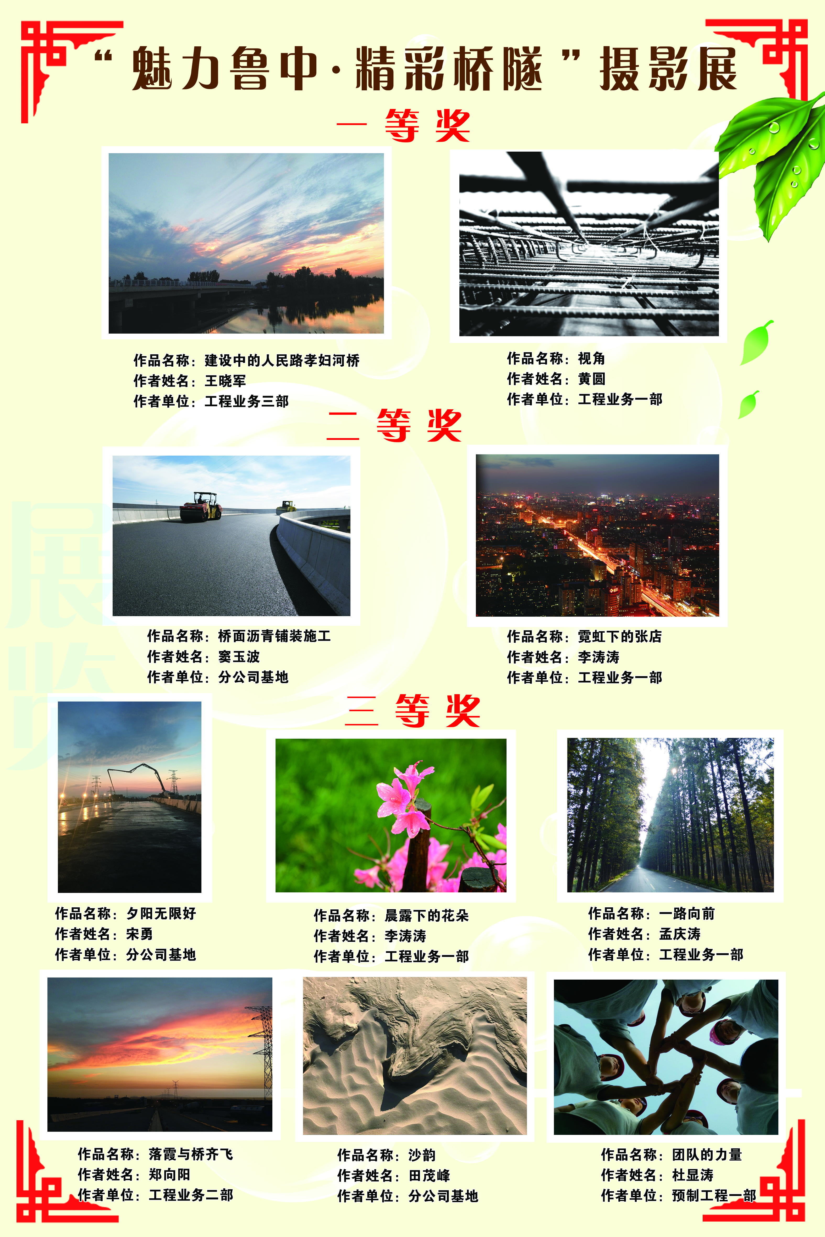 本次攝影展的主題定格為“魅力魯中,精彩橋隧”,通過攝影作品,充分體現(xiàn)了廣大職工扎根魯中公路、奉獻魯中公路的歸屬感,充分展示了橋隧分公司勇于擔當、敢為人先的責任感。攝影展共計征集到來自橋隧分公司各生產(chǎn)單位的海選作品二百余幅,經(jīng)過公司人力資源部協(xié)助聯(lián)系相關(guān)專家進行評審,評選出了一等獎2名,二等獎2名,三等獎6名,優(yōu)秀獎10名,橋隧分公司為獲獎?wù)哳C發(fā)了榮譽證書,并且分別給予了一定的物質(zhì)獎勵。