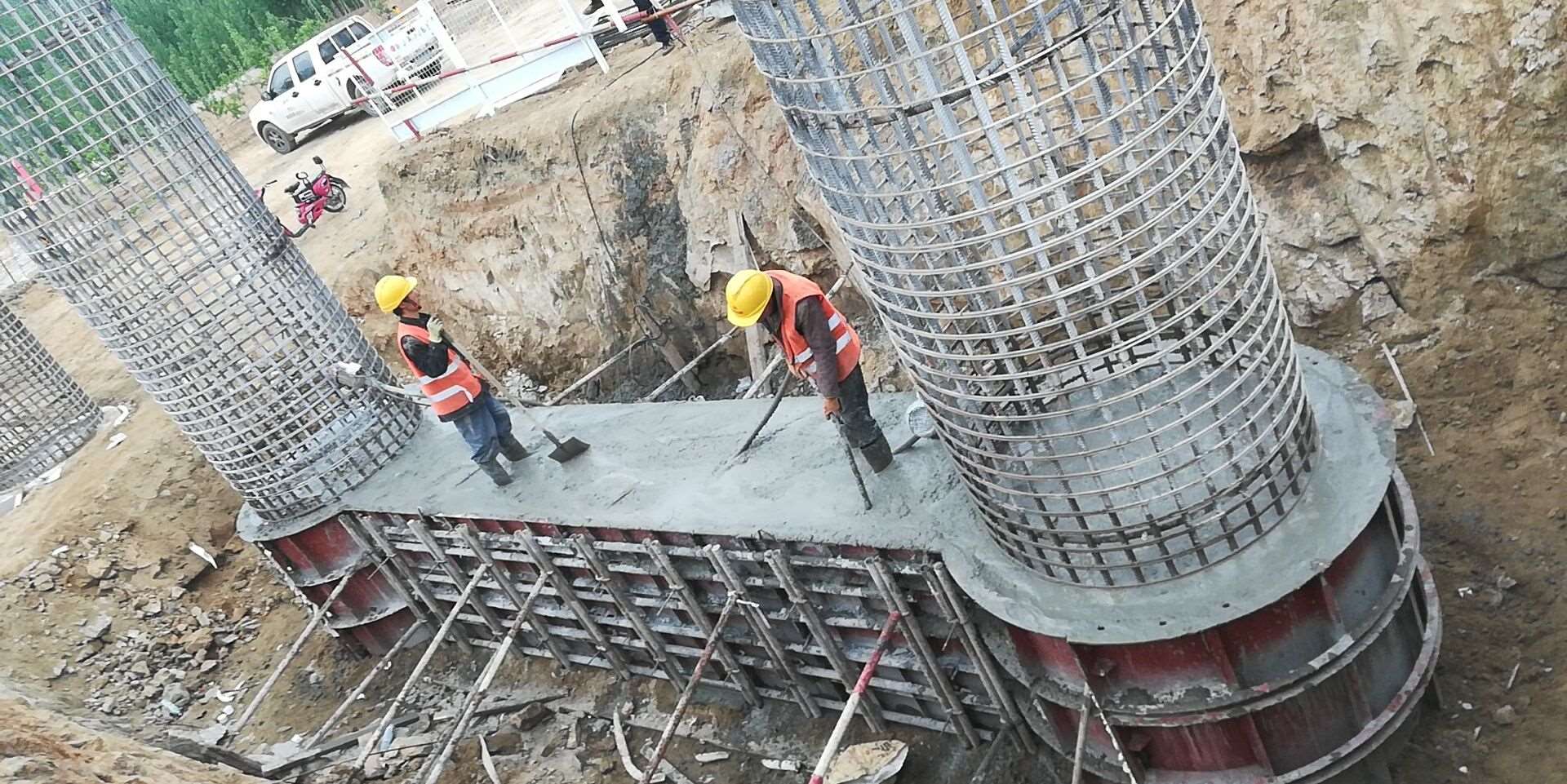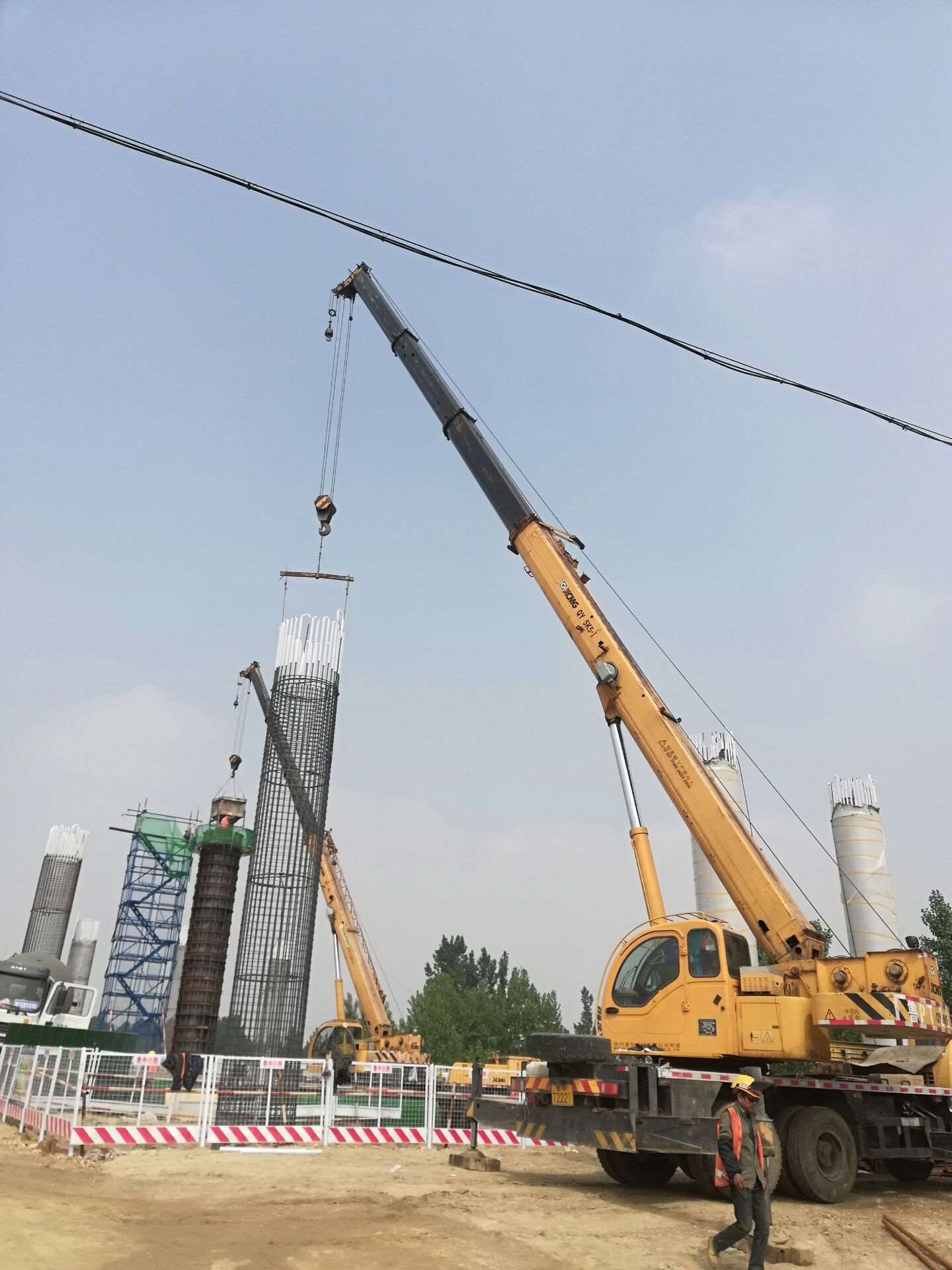 興隆莊特大橋施工現(xiàn)場,現(xiàn)場負(fù)責(zé)人朱恒正在指揮機(jī)械、工人進(jìn)行墩柱及系梁澆筑施工。