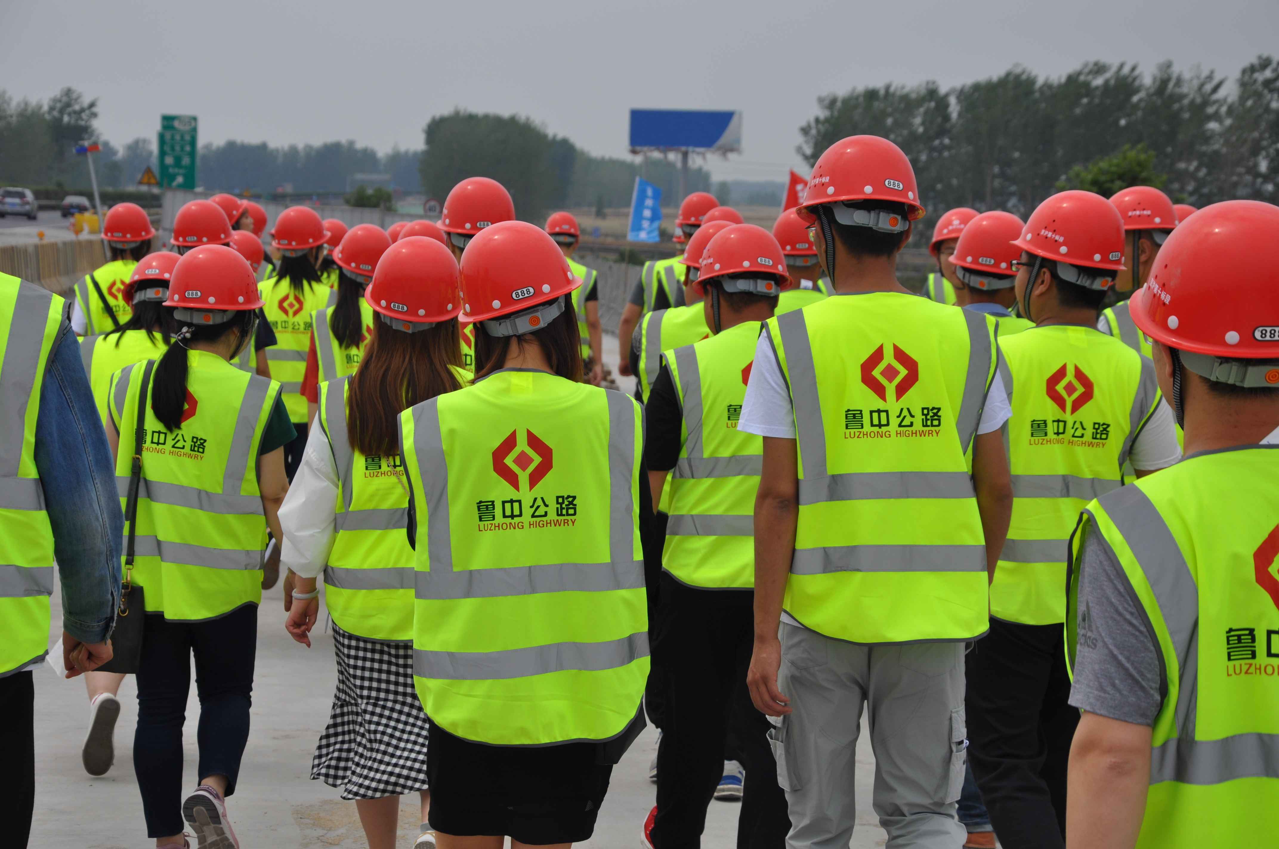 參觀完項(xiàng)目部,一行人再次登上大巴車,前往G2紅花埠主線橋施工現(xiàn)場(chǎng),小伙子為小姑娘們戴好安全帽、穿好反光衣