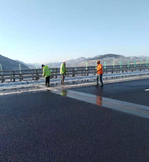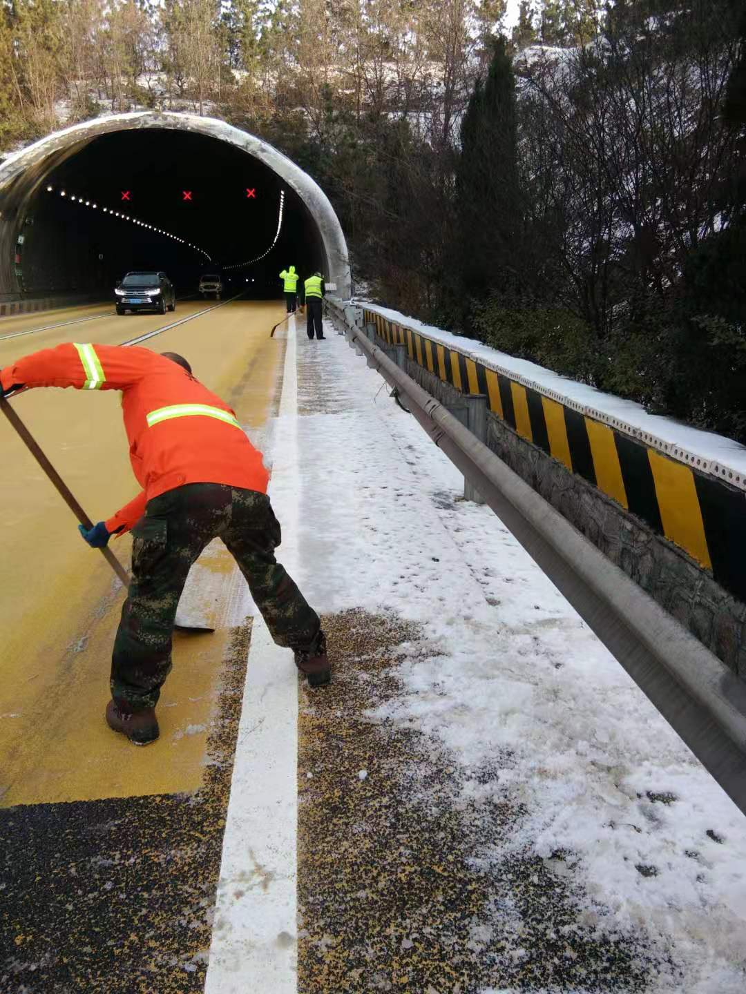 針對(duì)今年首個(gè)暴雪藍(lán)色預(yù)警,我項(xiàng)目部高度重視,在接到除雪防滑預(yù)警的第一時(shí)間部署開(kāi)展除雪防滑工作,與業(yè)主等養(yǎng)護(hù)部門(mén)聯(lián)動(dòng)協(xié)調(diào),及時(shí)發(fā)布除雪防滑工作信息。按照業(yè)主除雪防滑技術(shù)指南要求徹夜開(kāi)展除雪防滑工作,我項(xiàng)目部采取了撒布融雪劑、機(jī)械鏟雪、人工清雪等措施,并對(duì)橋梁、隧道、陡坡、震蕩標(biāo)線(xiàn)等重點(diǎn)地段進(jìn)行重點(diǎn)防控,切實(shí)做好除雪防滑工作。