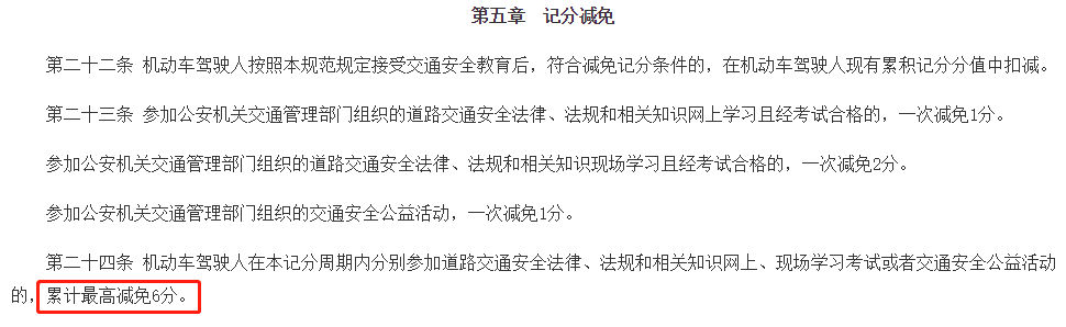 第二十四條 機(jī)動(dòng)車(chē)駕駛?cè)嗽诒居浄种芷趦?nèi)分別參加道路交通安全法律、法規(guī)和相關(guān)知識(shí)網(wǎng)上、現(xiàn)場(chǎng)學(xué)習(xí)考試或者交通安全公益活動(dòng)的,累計(jì)最高減免6分。