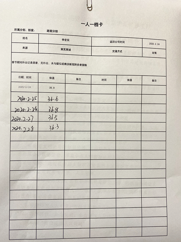實(shí)行進(jìn)場(chǎng)人員“一人一檔”制度,體溫動(dòng)態(tài)管理