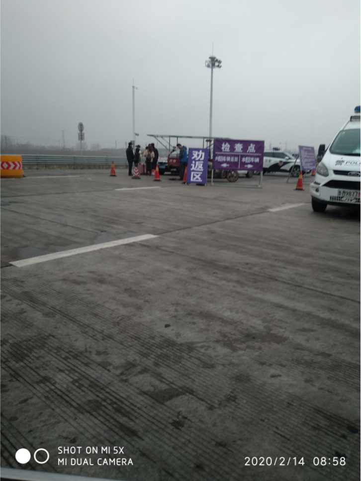 等待了一個小時二十分鐘后,看到業(yè)主拿著政府的批準(zhǔn)文件跟防疫人員交涉。此后代理和業(yè)主帶領(lǐng)我們通過收費站,進入開標(biāo)項目所在地域。圖片中標(biāo)識牌上寫著外省車輛返回和本省車輛檢查方向指示??磥硗馐≤囕v直接返回,不讓通過。