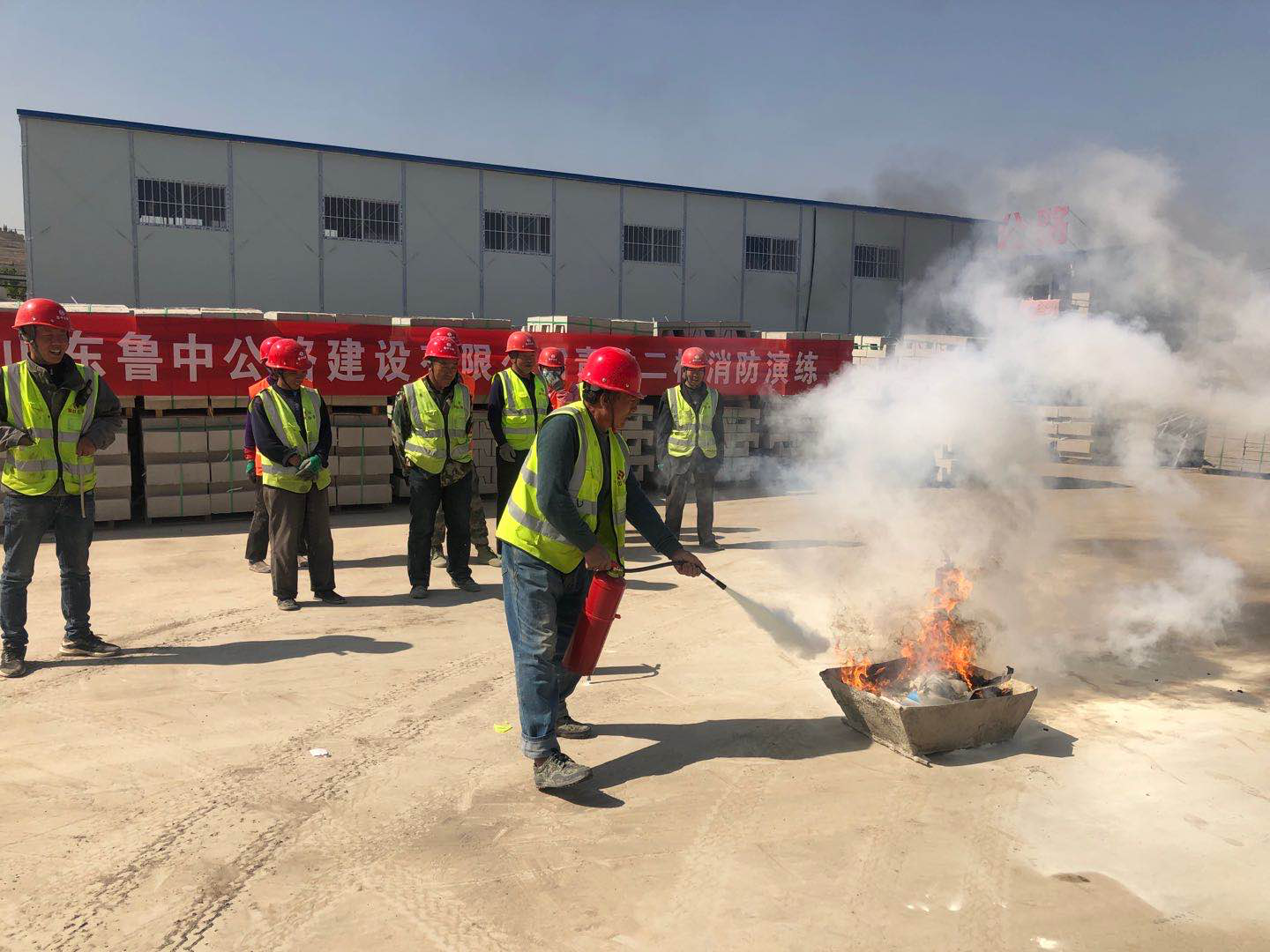 拌合站人員和民工隊伍依次學習如何正確使用干粉滅火器來有效快速消滅火情。