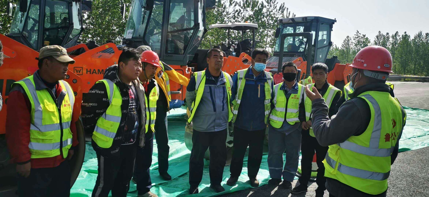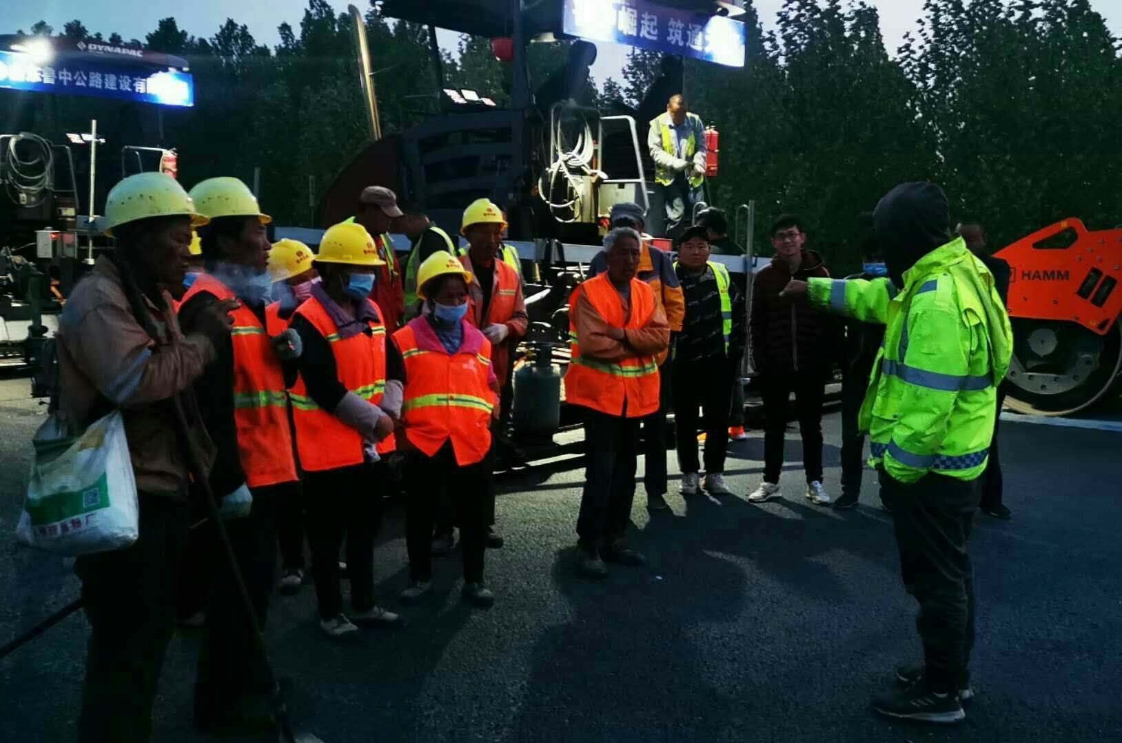 上面層試驗(yàn)路施工前分部經(jīng)理陳剛對(duì)施工員及機(jī)械操作手做安全技術(shù)交底。