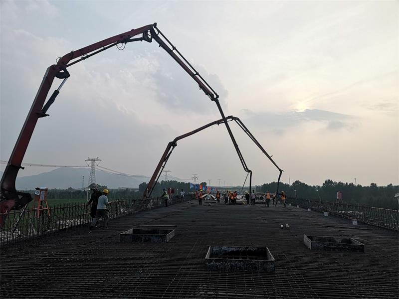 2020年7月5日16時50分,新寧項目部各施工保障小組準備完畢,整裝待發(fā),現(xiàn)場2輛混凝土泵車全部現(xiàn)場待命,隨著首車混凝土到達現(xiàn)場,K 59+088.719興隆莊特大橋第10聯(lián)右幅第1、2孔現(xiàn)澆箱梁正式開始澆筑混凝土。