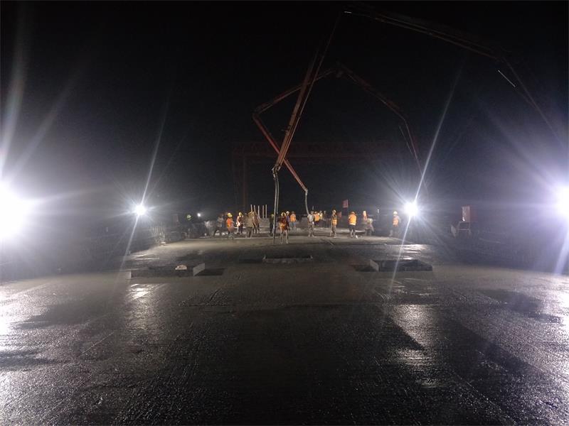 現(xiàn)場管理人員、技術人員和試驗人員全過程跟蹤作業(yè),經(jīng)過將近9小時的緊張奮戰(zhàn),順利完成了K 59+088.719興隆莊特大橋右幅第1、2孔的支架現(xiàn)澆箱梁底腹板混凝土澆筑。本次現(xiàn)澆箱梁順利完成澆筑標志著興隆莊特大橋現(xiàn)澆箱梁進入了關鍵性階段,為下一階段的砼澆筑奠定了堅實基礎。