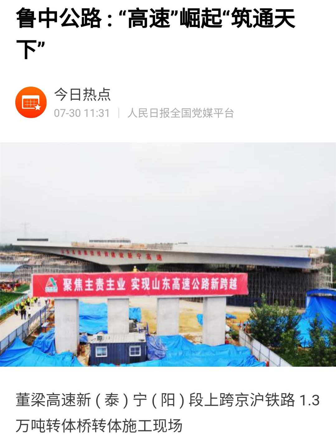 2020年7月30日,《淄博日?qǐng)?bào)》4版刊登了題為《董梁高速新(泰)寧(陽(yáng))段上跨京滬鐵路1.3萬(wàn)噸轉(zhuǎn)體橋成功轉(zhuǎn)身,淄博路企“走出去”再豎里程碑——魯中公路:“高速”崛起“筑通天下”》的文章。