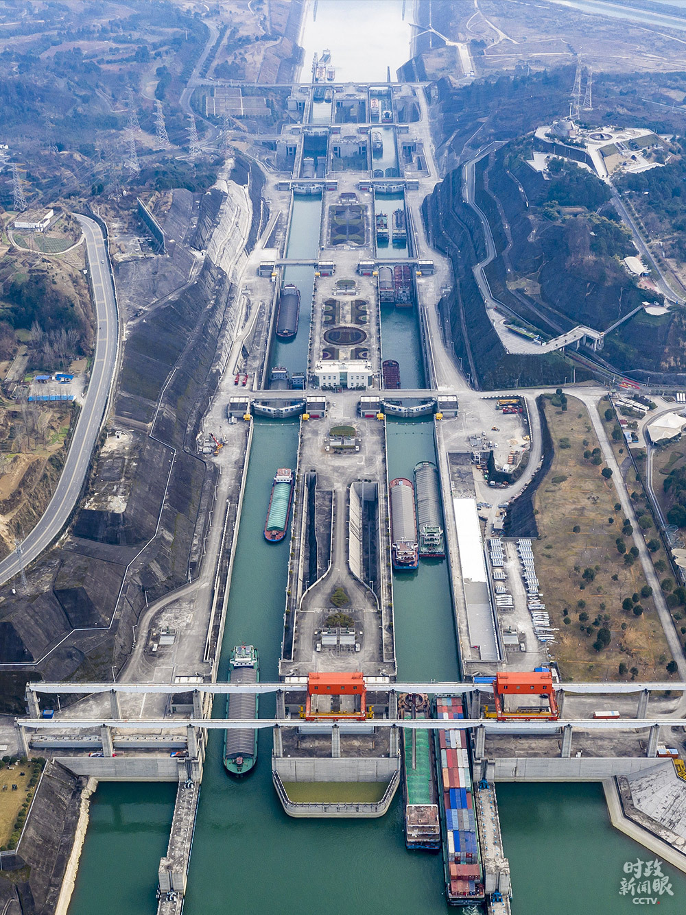 2021年1月10日,湖北宜昌,船舶有序行駛在三峽五級船閘。