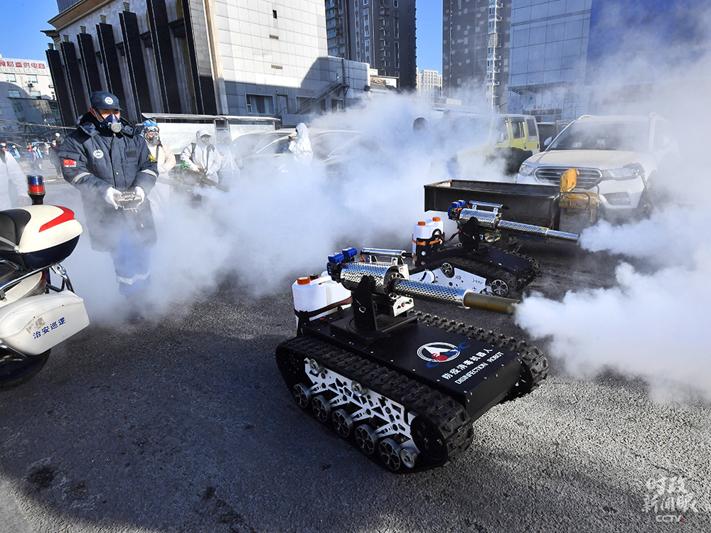 2021年1月9日,北京岳各莊市場,2臺“坦克”防疫消殺機器人對市場進行消殺。這種消殺“新裝備”裝有大容量藥壺,每小時消殺約10000平方米。