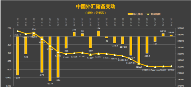 但是這一年也是從高點(diǎn)回落的轉(zhuǎn)折點(diǎn),到年底的時(shí)候,我們的外匯儲備足足減少了5000億美元,隨后的2016年又減少了3000億美元,最終在2017年1月最低的時(shí)候降到了不到3萬億美元,隨后便開始逐步企穩(wěn)反彈,將下降趨勢最終遏制住了,至今始終維持在3萬億美元以上。