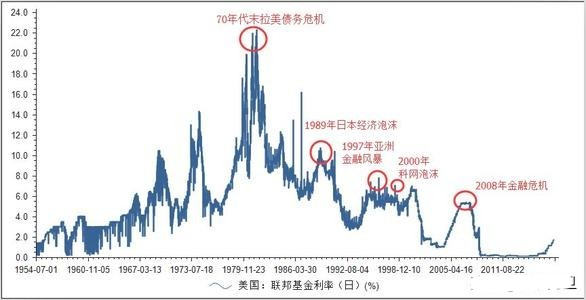 美聯(lián)儲近十年來的首次加息,其實(shí)既不是因?yàn)槠鋰鴥?nèi)經(jīng)濟(jì)轉(zhuǎn)熱,也不是因?yàn)橥浱ь^,這是一個(gè)向全世界發(fā)出的行動(dòng)信號,美國的每一次的緊縮周期,必然要讓在此之前釋放出去的美元,帶著財(cái)富回流,所以美聯(lián)儲一旦加息,就是吹響了美元回家的號角。我在網(wǎng)上找到一張圖,正是對美國利用金融周期收割別國財(cái)富的最好注釋,大多數(shù)時(shí)候的危機(jī)都是在美聯(lián)儲發(fā)動(dòng)的緊縮周期時(shí)發(fā)生的。