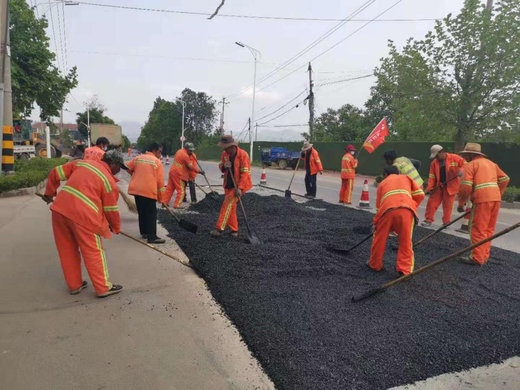 博山小修項目管養(yǎng)路段均為山區(qū)路段且重型車輛較多,路面坑槽、沉陷嚴(yán)重。此階段主要完成季節(jié)小修工程中瀝青胡凝土挖補(bǔ)及貼補(bǔ)。針對病害位置過于零散的現(xiàn)狀,為盡快完成施工任務(wù),早晨天剛蒙蒙亮,施工人員的身影便已經(jīng)出現(xiàn)在施工現(xiàn)場。施工過程中嚴(yán)把作業(yè)區(qū)布設(shè)、揚(yáng)塵防治、施工質(zhì)量三關(guān),確保了坑槽、沉陷修補(bǔ)完善。
