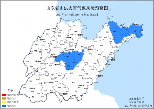 8月30日18時,山東省水利廳和山東省氣象局聯(lián)合發(fā)布山洪災(zāi)害氣象預(yù)警:預(yù)計(jì)8月30日20時至8月31日20時,威海、煙臺、淄博、濟(jì)南、濰坊、泰安、臨沂等市局部地區(qū)可能發(fā)生山洪災(zāi)害(藍(lán)色預(yù)警)。包括:環(huán)翠區(qū)、榮成市、文登區(qū)大部、乳山市西部及北部、蓬萊區(qū)、萊山區(qū)、福山區(qū)大部、牟平區(qū)大部、棲霞市大部、海陽市大部、萊陽市東部、龍口市東部、博山區(qū)、淄川區(qū)大部、沂源縣大部、鋼城區(qū)大部、萊蕪區(qū)大部、章丘區(qū)南部、歷城區(qū)東南部、臨朐縣大部、青州市南部、昌樂縣中西部、新泰市東北部、蒙陰縣北部。