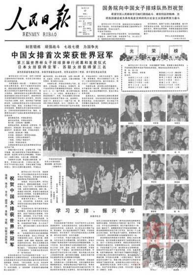 次日《人民日?qǐng)?bào)》頭版:《學(xué)習(xí)女排,振興中華——中國(guó)贏(yíng)了》,評(píng)論員寫(xiě)道,“用中國(guó)女排的這種精神去搞現(xiàn)代化建設(shè),何愁現(xiàn)代化不能實(shí)現(xiàn)?”