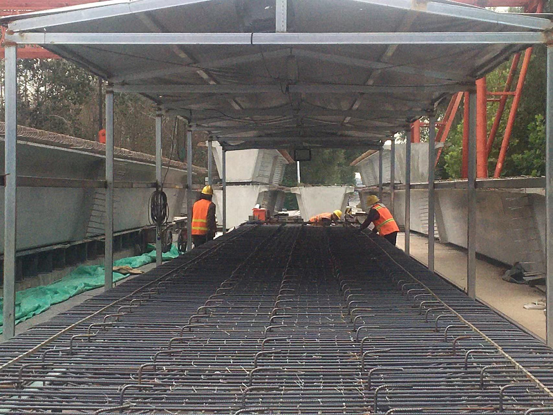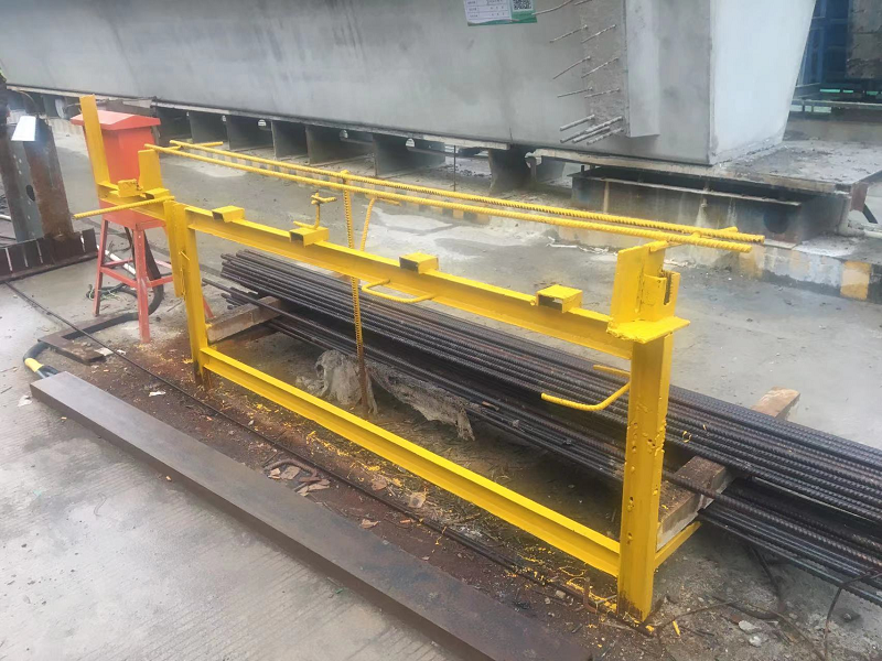 按照?qǐng)D紙?jiān)O(shè)計(jì),該鋼筋縱向間距50cm,橫向隨頂板橫筋布置,每根橫筋布置5根。初期施工時(shí),加工了頂板筋臺(tái)架,頂板筋在臺(tái)架上全部綁扎完成,工人在成型的鋼筋頂部利用兩側(cè)臺(tái)架搭設(shè)工作平臺(tái),蹲在平臺(tái)上后退著逐個(gè)焊接拉結(jié)筋。縱向通過(guò)拉線,橫向通過(guò)尺量定位,功效慢,干擾多,勞動(dòng)強(qiáng)度大,定位不準(zhǔn)確,線形不順直,外觀質(zhì)量較差。
