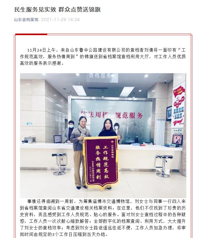 2021年11月29日,山東省檔案館公眾號推送了題為《民生服務(wù)見實效 群眾點贊送錦旗》的文章,講述了山東魯中公路建設(shè)有限公司為省檔案館送上錦旗的故事。