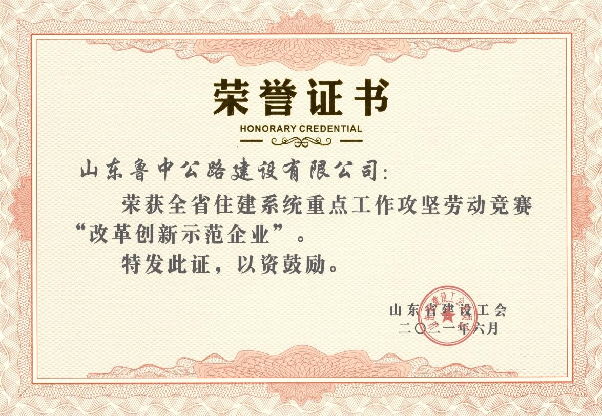 近日,公司領(lǐng)取到山東省建設(shè)工會(huì)頒發(fā)的全省住建系統(tǒng)重點(diǎn)工作攻堅(jiān)勞動(dòng)競(jìng)賽“改革創(chuàng)新示范企業(yè)”榮譽(yù)證書。