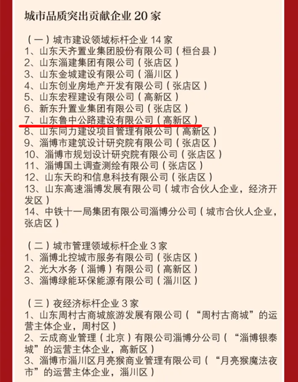 2022年2月7日,淄博市召開(kāi)全市品質(zhì)提升年動(dòng)員大會(huì),淄博市委副書(shū)記、市長(zhǎng)馬曉磊主持會(huì)議。會(huì)議通報(bào)了2021年我市支持企業(yè)發(fā)展的各項(xiàng)政策落實(shí)情況,宣讀了淄博市委、市政府關(guān)于表彰“落實(shí)突破年”和鄉(xiāng)村振興工作先進(jìn)集體和先進(jìn)個(gè)人的決定。會(huì)上,還為新經(jīng)濟(jì)引領(lǐng)、產(chǎn)業(yè)強(qiáng)市、科技創(chuàng)新、金融賦能突出貢獻(xiàn)企業(yè)代表,為外貿(mào)投資、生態(tài)文明、文旅繁榮、城市品質(zhì)、社會(huì)責(zé)任九大領(lǐng)域選樹(shù)的200家突出貢獻(xiàn)企業(yè)(單位)代表頒獎(jiǎng)。其中,山東魯中公路建設(shè)有限公司榮獲城市品質(zhì)突出貢獻(xiàn)企業(yè)榮譽(yù)。