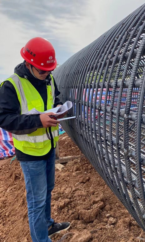 橋涵七工區(qū)李軒在對照圖紙對鋼筋籠進行量測