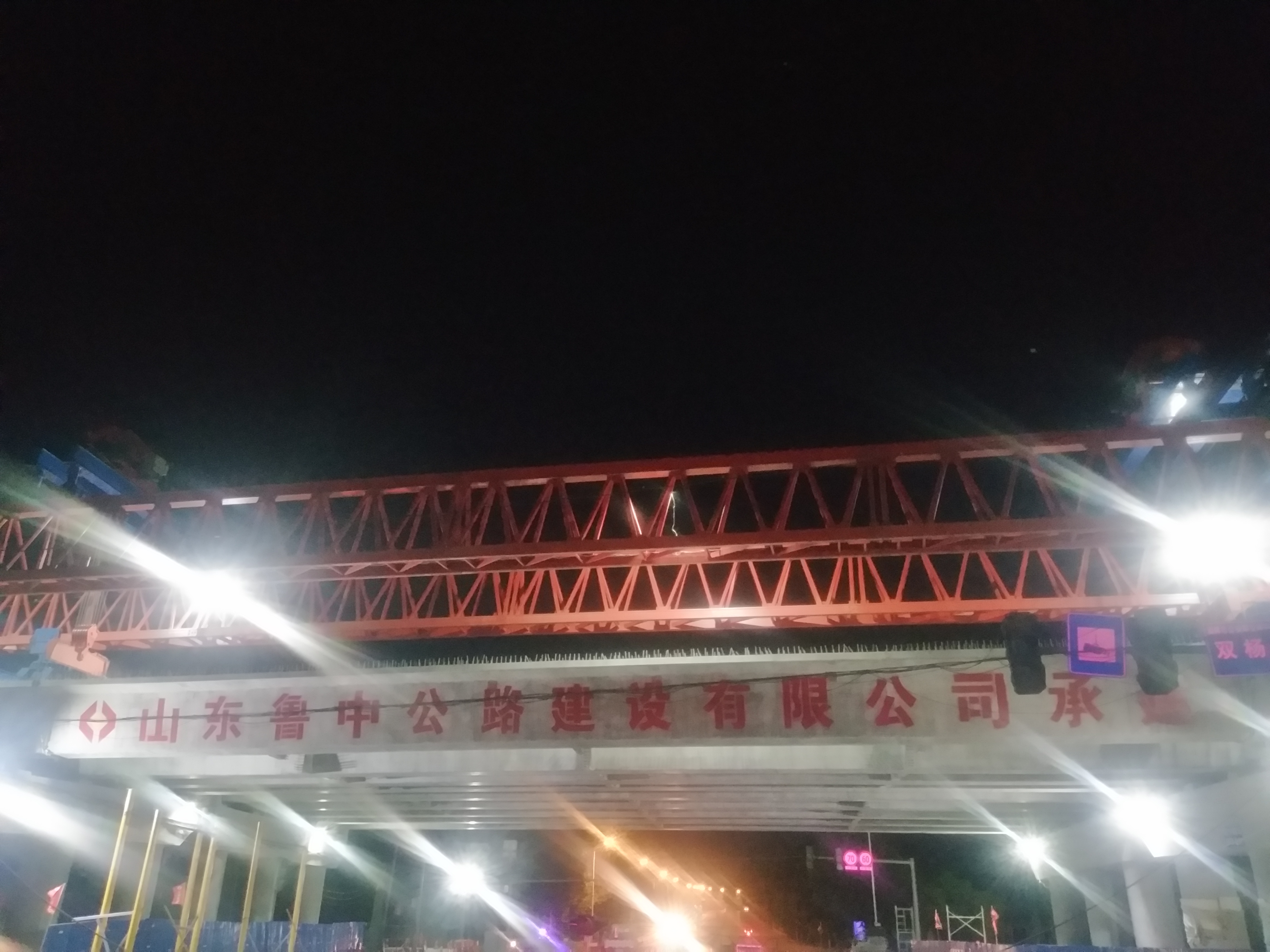 前期積極準(zhǔn)備,制定下設(shè)施工防護大棚,車輛兩側(cè)便道分流,凌晨集中施工的方案。凌晨的夜寂靜祥和,然而張博路卻干的熱火朝天,為了不延誤工期,我們必須打起十二分的精神,順利確保十片箱梁準(zhǔn)確無誤跨過張博路。