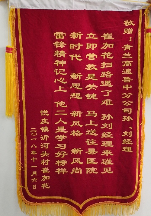 事后為了表示感謝,養(yǎng)護(hù)員崔加花及家屬一同到青蘭高速公路小修保養(yǎng)項(xiàng)目部給項(xiàng)目人員贈(zèng)送了錦旗,崔家花激動(dòng)地說:“魯中真是一個(gè)溫暖的大家庭,希望等身體好了以后再跟大家一起奮斗。