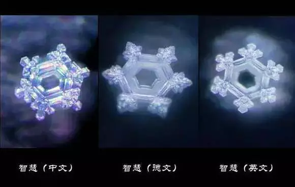 聽無論是哪種語言,當(dāng)水看到"智慧"后,其結(jié)晶都非常整齊而美麗。圖片依次為左圖智慧(中文)、右圖wisdom(英文)、中圖weishieit(德文)。