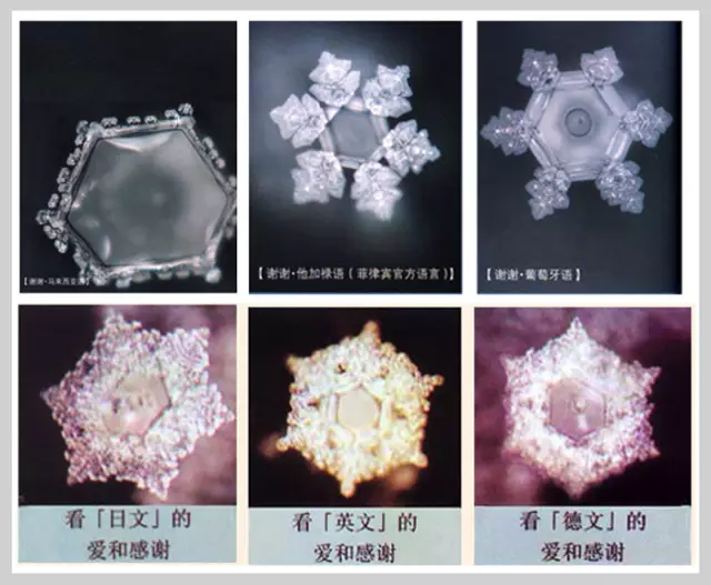 無論是日、英、德任何一種語言,當(dāng)水看到"謝謝"后,其結(jié)晶都非常整齊而美麗。與此相反,不管是哪個(gè)國家的語言,只要是聽了帶有辱罵及攻擊性的,例如"渾蛋"等字眼的水,便都散亂得無法形成結(jié)晶,而且樣子還慘不忍睹。