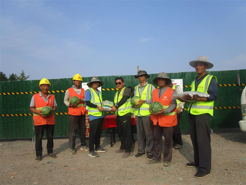 “講關懷、送清涼”小組人員從道路小樁號開始依次對路基、橋涵各分部送去藿香正氣水、郎秀礦泉水、綠豆、西瓜、工程項目施工人員安全指導手冊?;顒舆^程中,小組人員與現(xiàn)場人員對工作環(huán)境、工作時間等進行交流,橋涵一分部施工人員說道:“感謝項目部給一線工人送來的防暑降溫物品,送的是清涼,心里卻暖暖的”。