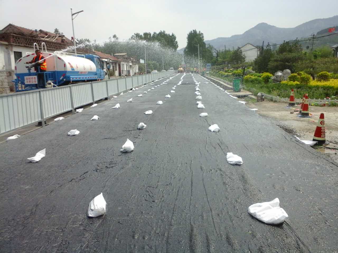 用裝料編織袋壓蓋雙層養(yǎng)生毯,灑水車側(cè)面噴灑養(yǎng)生。