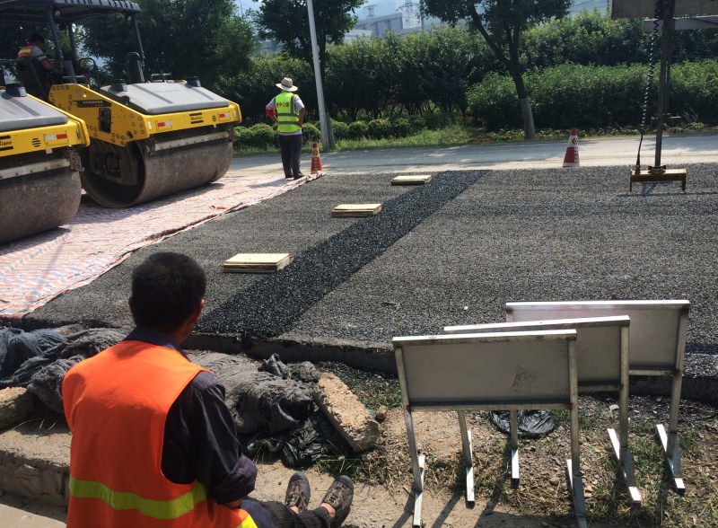 壓路機準(zhǔn)備就位,接頭處鋪筑石屑以利于接頭。